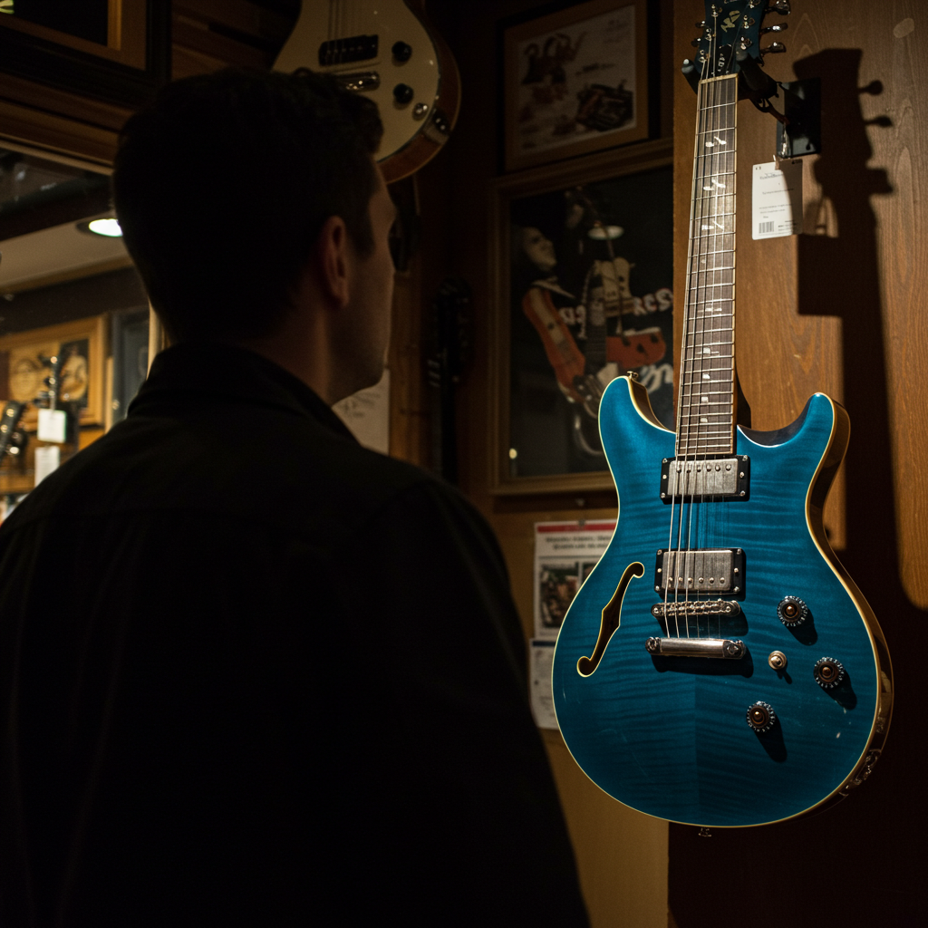 An acoustic guitar is my main instrument and use electric mostly for spreading pixie dust. In the middle are arch tops and I wanted one, but with a smaller body. The local family owned music store had a used blue PRS hollow body archtop, so I bought it. It’s the only song I ever wrote on an electric guitar.